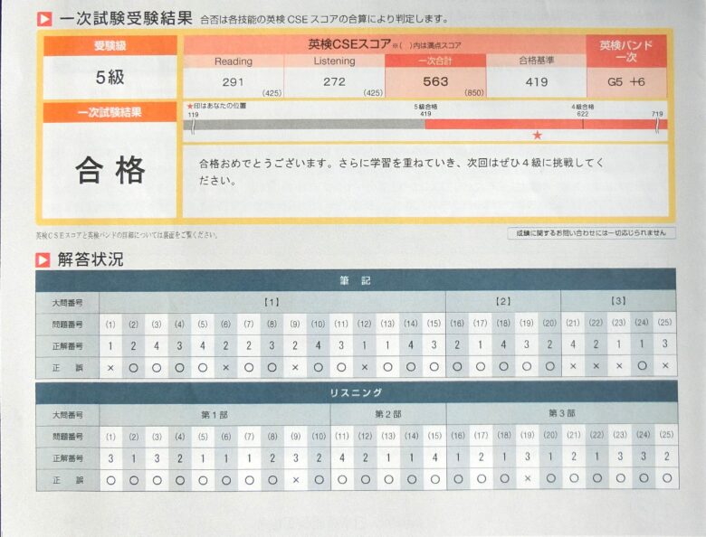 できれば答えを問題用紙に書いといてとお願いしていたのですが、思ったとおり真っ白でリスニングの答えもわからず、オンラインの合格発表まで生きた心地がしませんでした。